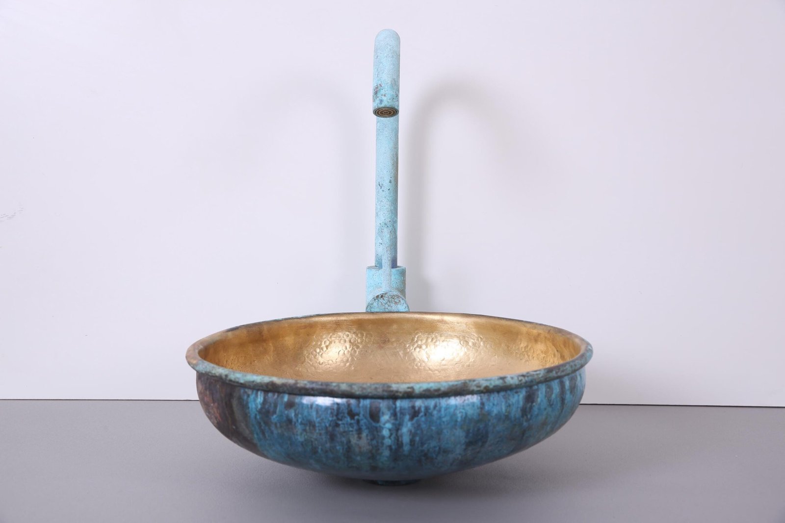 Transform your bathroom with this handmade Moroccan oxidized brass sink, crafted by skilled artisans using traditional metalworking techniques. This unique vessel sink features a stunning aged green patina on the exterior and a warm hammered copper interior, creating a beautiful contrast that instantly elevates any modern, rustic, or boho bathroom design.